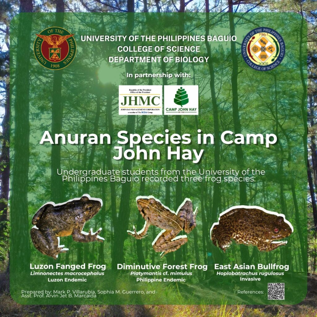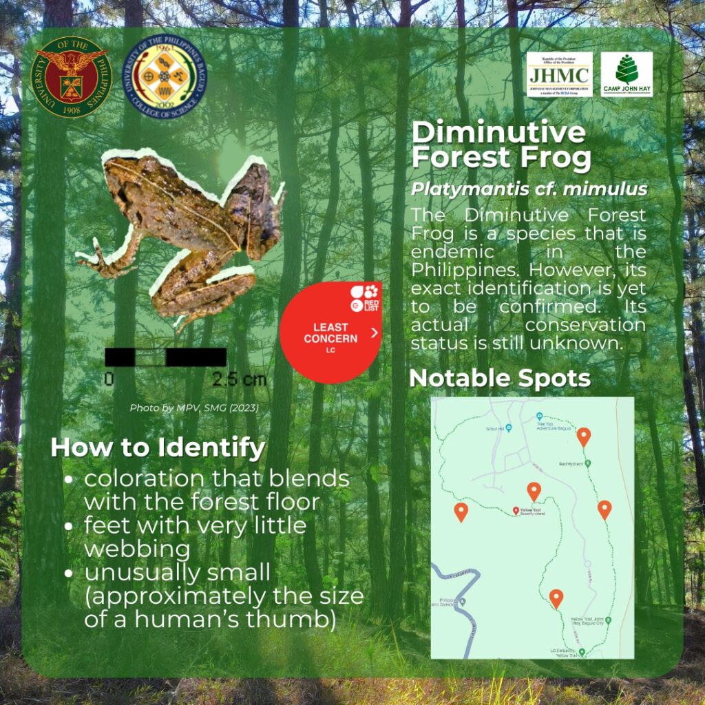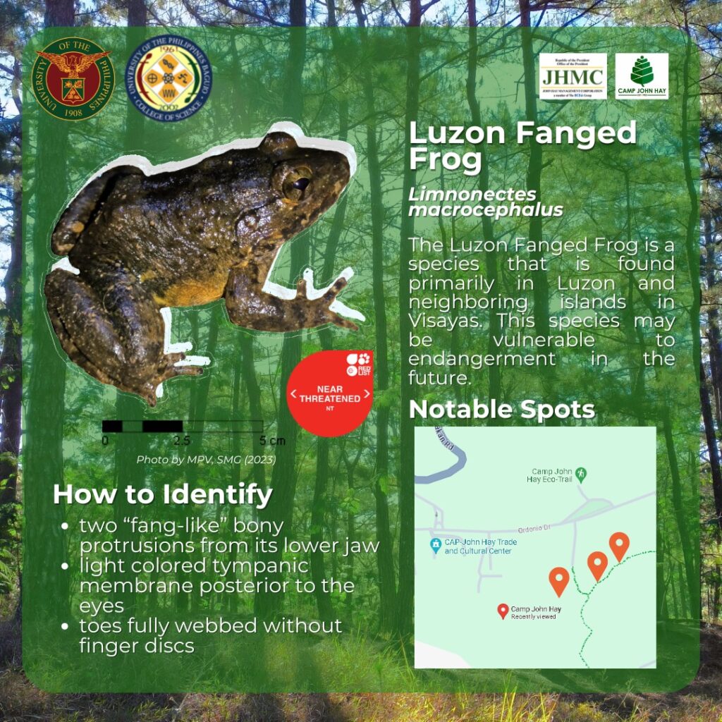 Two (2) of these species are Luzon and Philippine endemics. The Luzon fanged frog is designated by the IUCN as a Near Threatened species indicating its vulnerability to endangerment. Meanwhile, the Diminutive Forest Frog is a species endemic to the Philippines but its exact identification is yet to be confirmed. So, its conservation status still needs to be clarified.