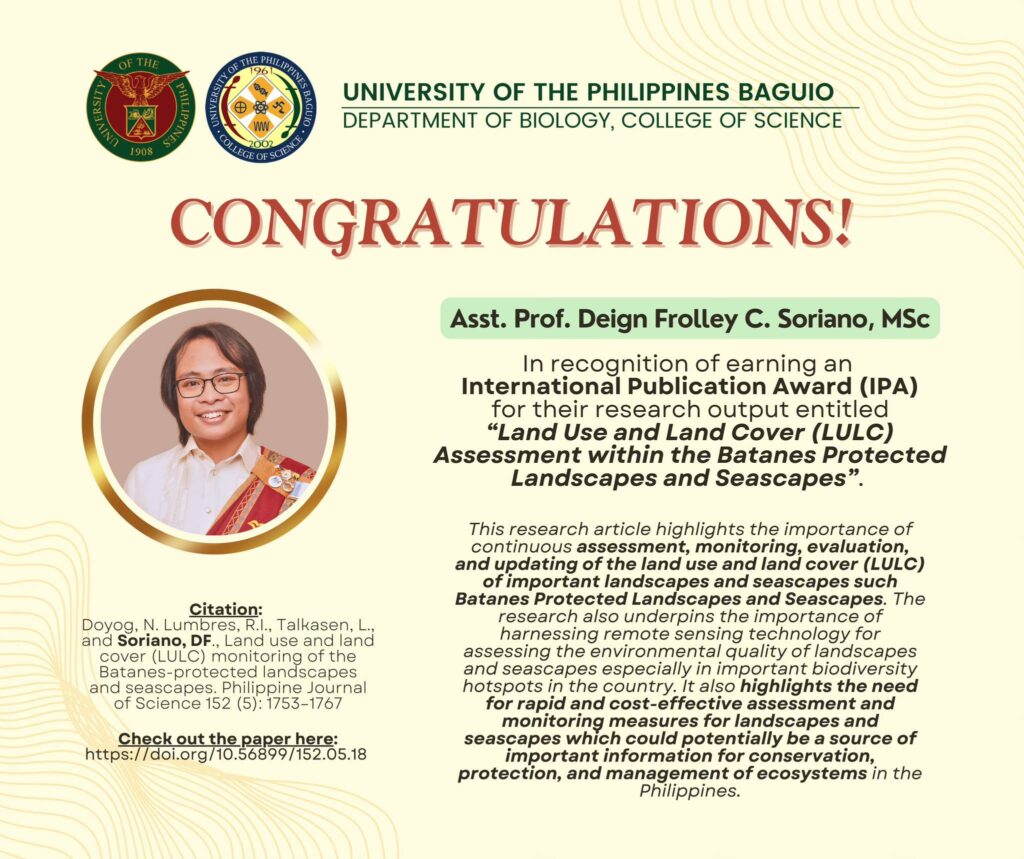 Asst. Prof. Deign Frolley C. Soriano, of the Department of Biology, College of Science, University of the Philippines Baguio has earned an International Publication Award (IPA) for his collaborative research work entitled “Land Use and Land Cover (LULC) Assessment within the Batanes Protected Landscapes and Seascapes”!