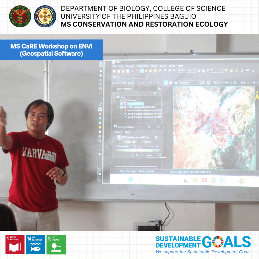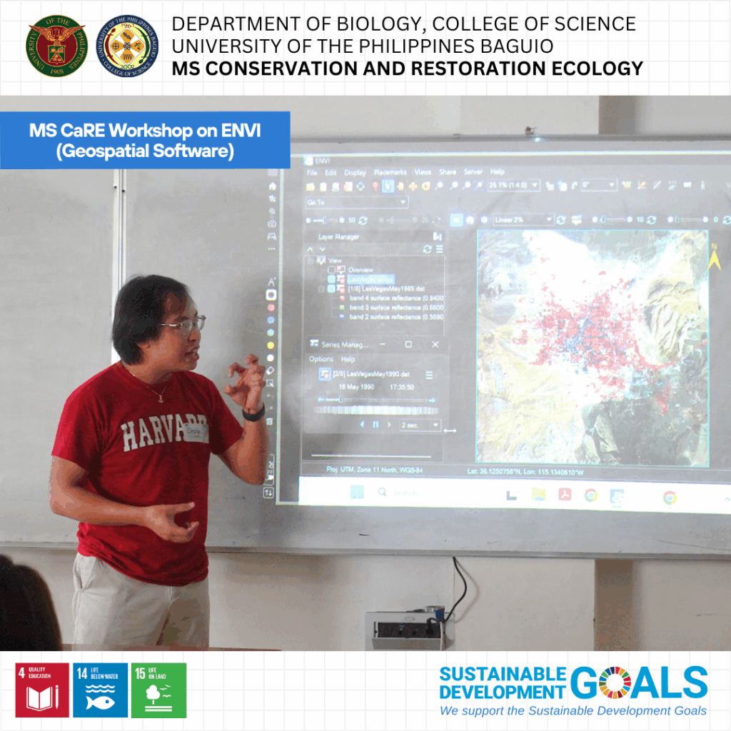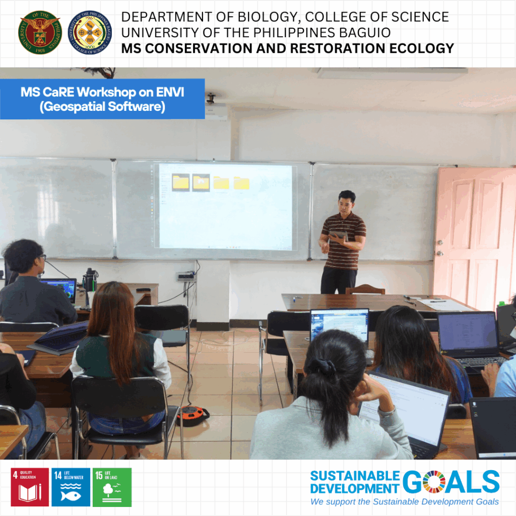 Fourteen graduate students from the MS Conservation and Restoration Ecology (MS CaRE) program participated in a specialized workshop on the use of Environment for Visualizing Images (ENVI), a geospatial software recently acquired by the Department of Biology through MS CaRE GTFI funds.