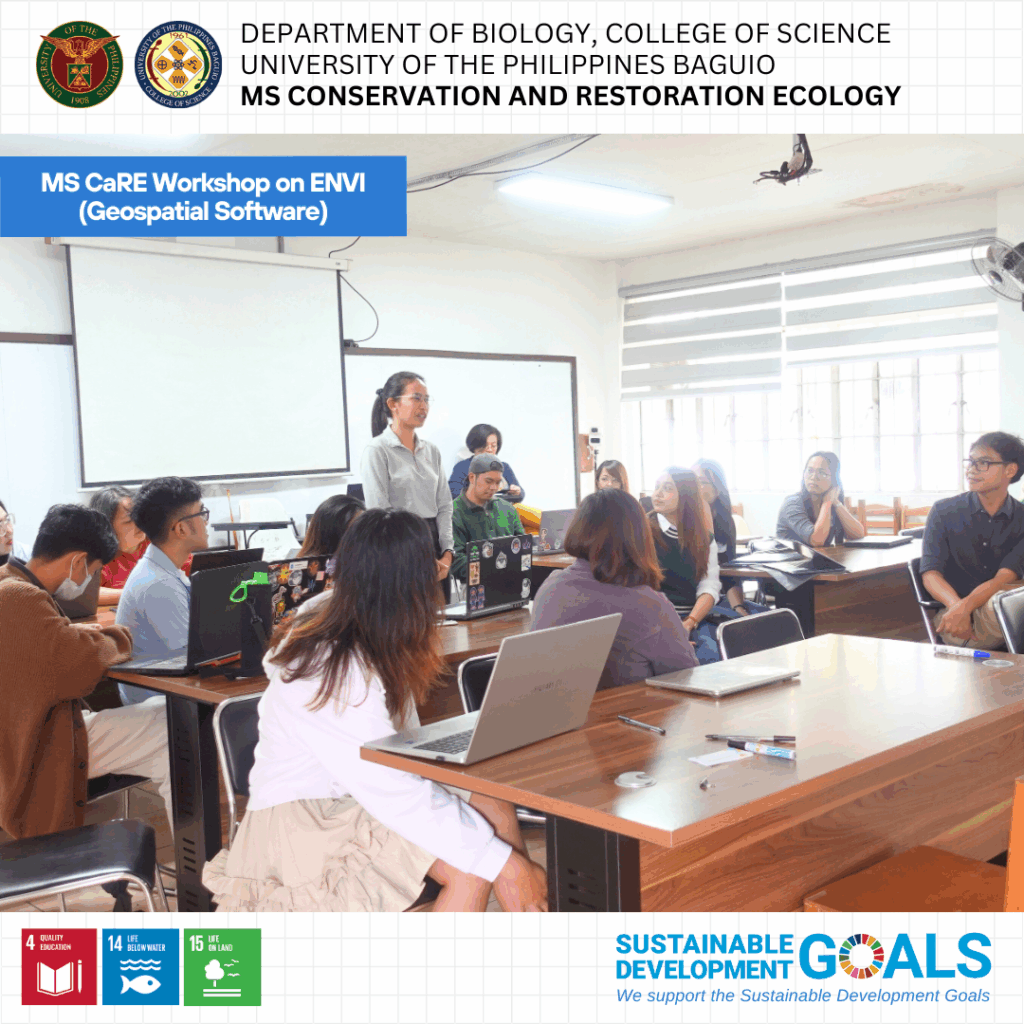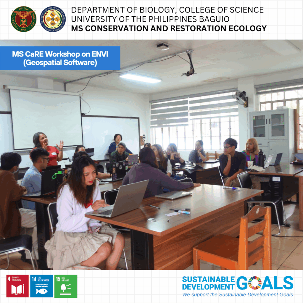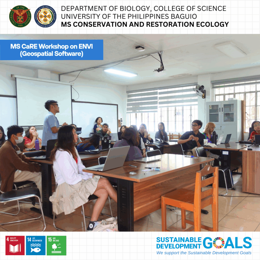 Fourteen graduate students from the MS Conservation and Restoration Ecology (MS CaRE) program participated in a specialized workshop on the use of Environment for Visualizing Images (ENVI), a geospatial software recently acquired by the Department of Biology through MS CaRE GTFI funds.