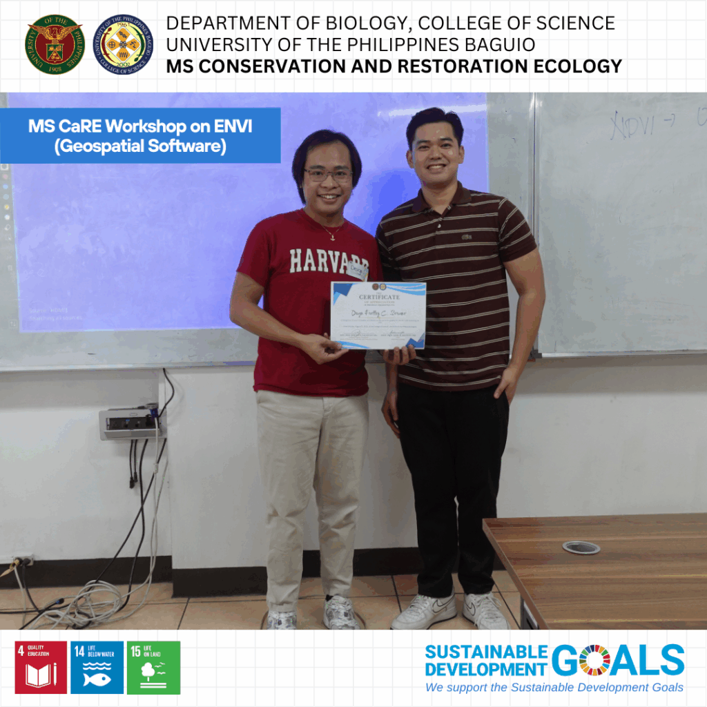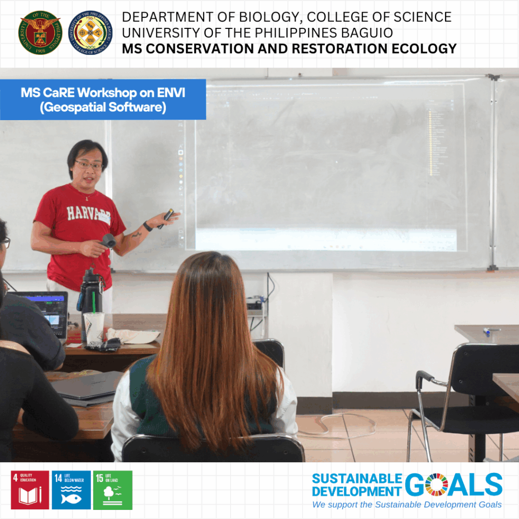 The workshop, held last August 21. 2025 at the IB Building, University of the Philippines Baguio, aimed to provide students with essential tools and skills to support their graduate research endeavors. It opened with welcoming remarks from Asst. Prof. Jeno Rey Pagaduan, the newly appointed MS CaRE Graduate Program Coordinator. This was followed by a lecture and hands-on session led by Asst. Prof. Deign Frolley Soriano, former faculty member and one of the Department’s GIS experts.