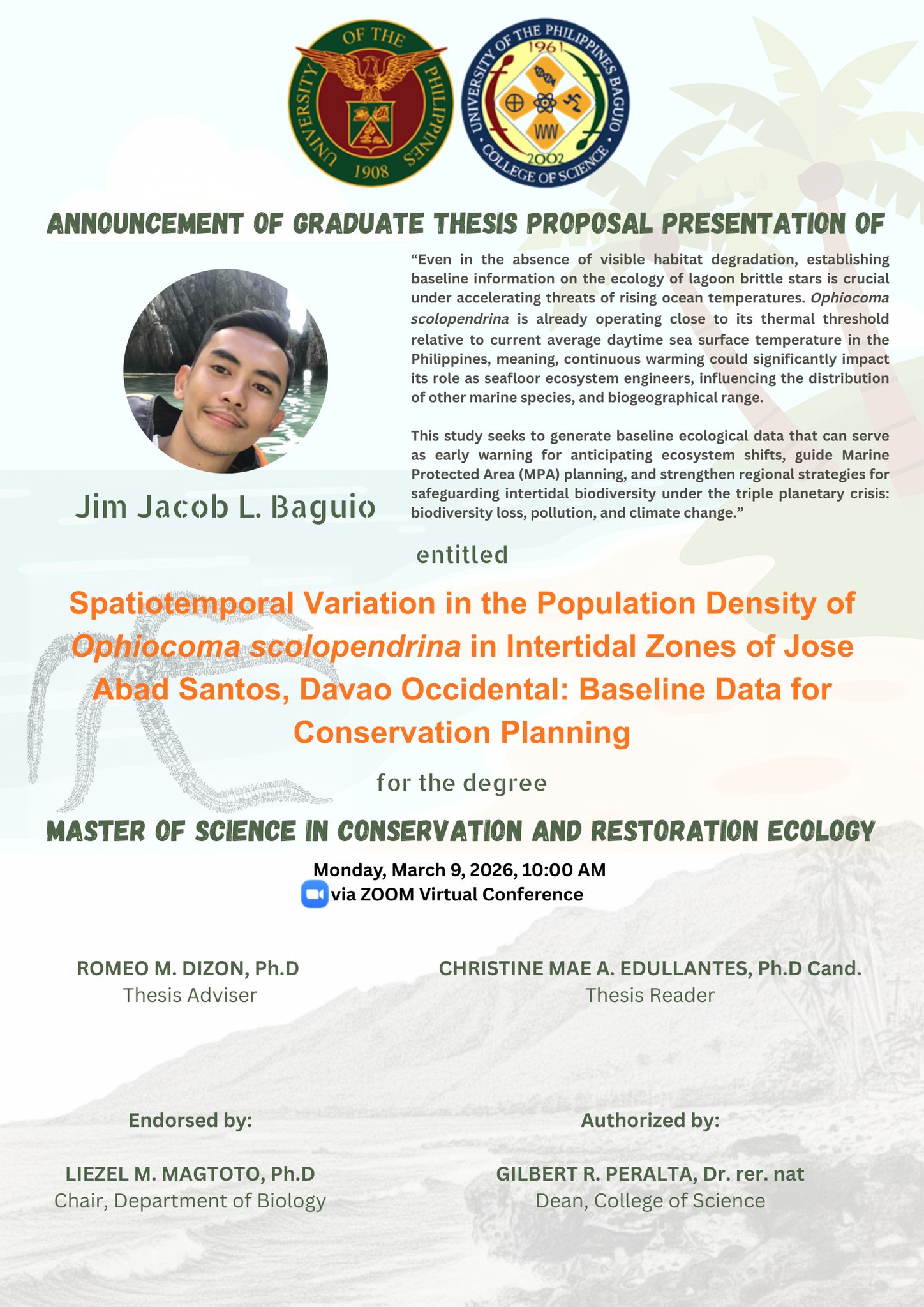 The Department of Biology is delighted to share the public announcement of the thesis proposal defense by MS CaRE Student Jm Jacob L Baguio, as he presents his thesis entitled “Spatiotemporal variation in the population density of 𝘖𝘱𝘩𝘪𝘰𝘤𝘰𝘮𝘢 𝘴𝘤𝘰𝘭𝘰𝘱𝘦𝘯𝘥𝘳𝘪𝘯𝘢 in the intertidal zones of San Jose Abad Santos, Davao Occidental: Baseline Data for Conservation Planning.”