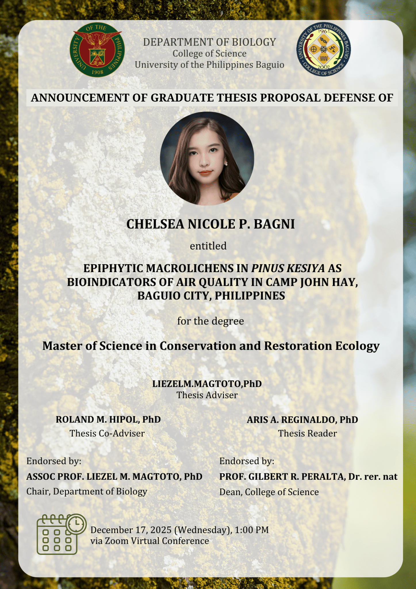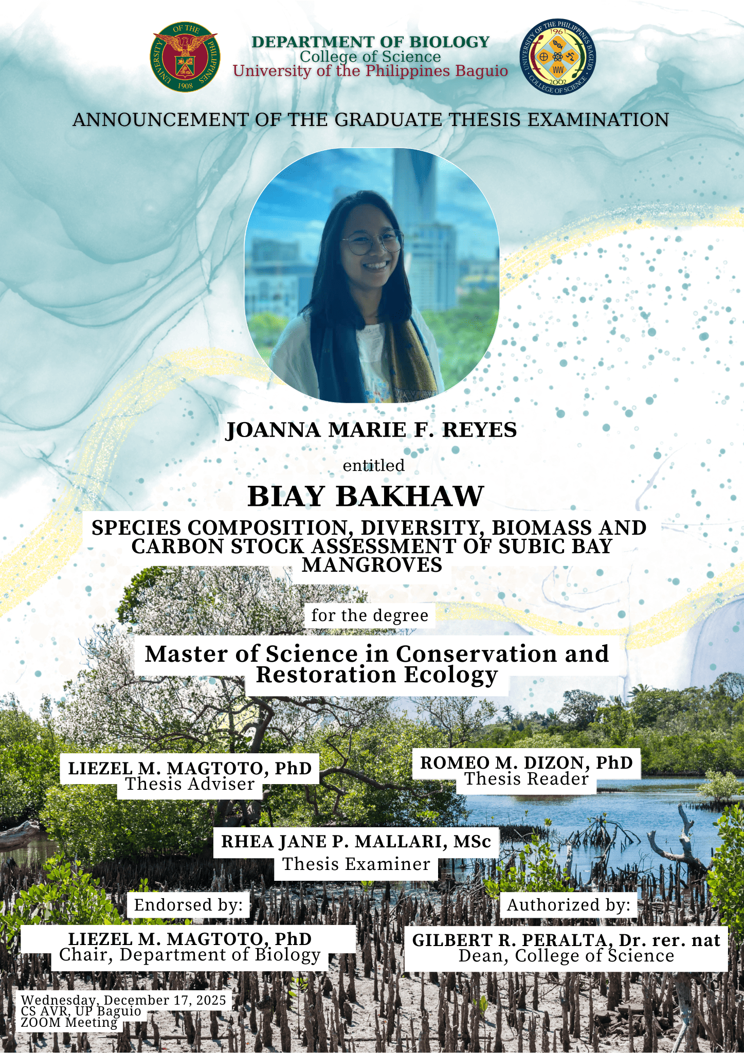 📢𝐆𝐫𝐚𝐝𝐮𝐚𝐭𝐞 𝐓𝐡𝐞𝐬𝐢𝐬 𝐄𝐱𝐚𝐦𝐢𝐧𝐚𝐭𝐢𝐨𝐧 𝐀𝐧𝐧𝐨𝐮𝐧𝐜𝐞𝐦𝐞𝐧𝐭 📢 The MS CaRE Program of the Department of Biology, College of Science, University of the Philippines Baguio, invites the public community to the graduate thesis […]